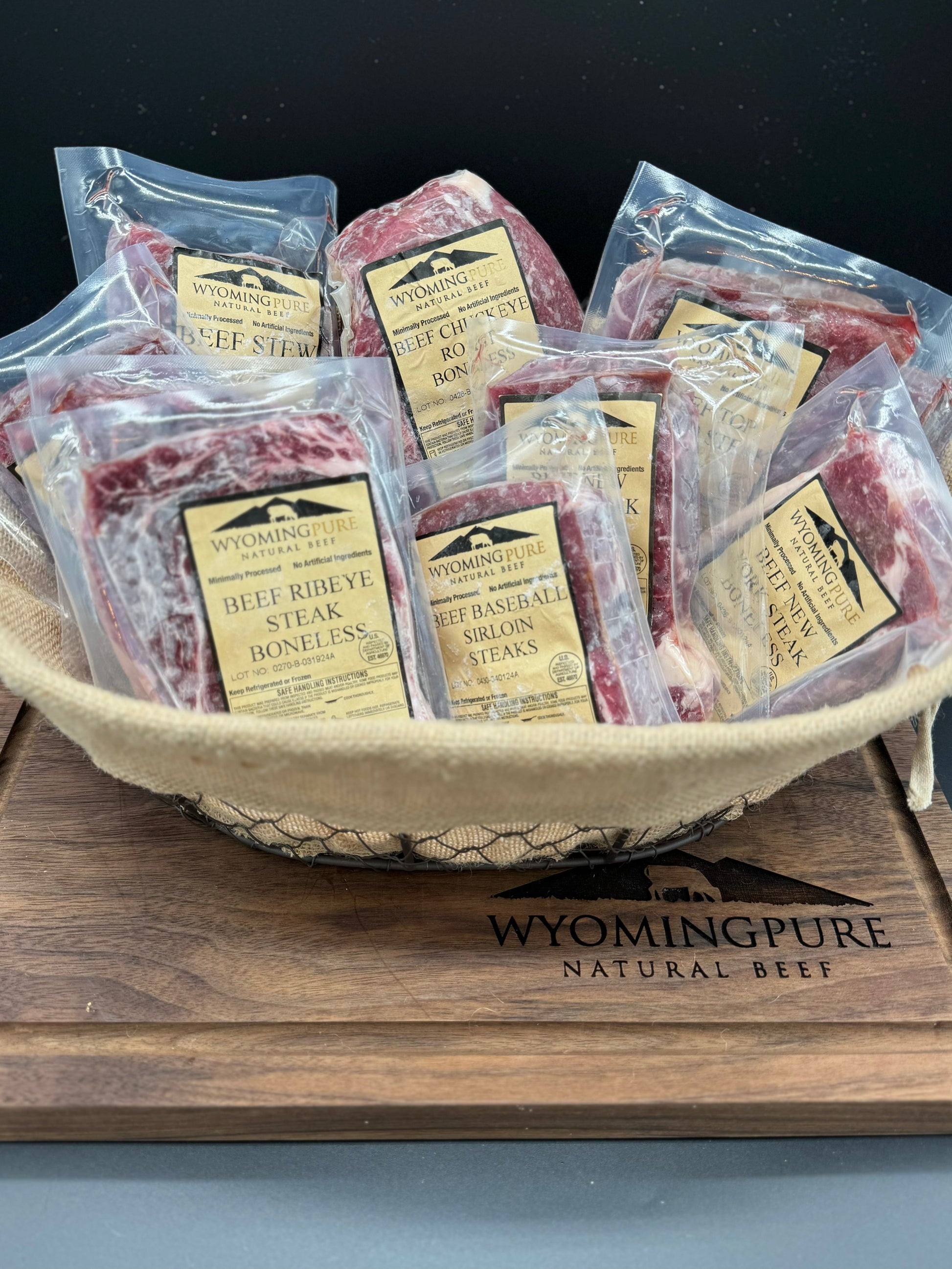 2 Ribeye Steaks (14-15oz), 2 New York Steaks (12-13 oz), 2 Baseball Sirloin Steaks (1 pkg, approx. 9 oz per steak), 2 lbs. Round Steaks, 2 lbs. Stew Meat, 1 Roast (about 3 lbs.), and 15 lb. Ground Beef (regular or 90/10).