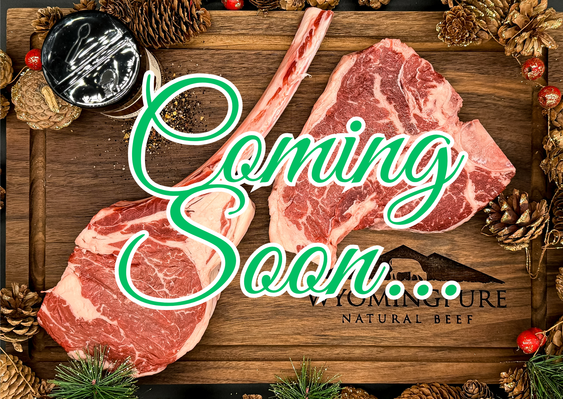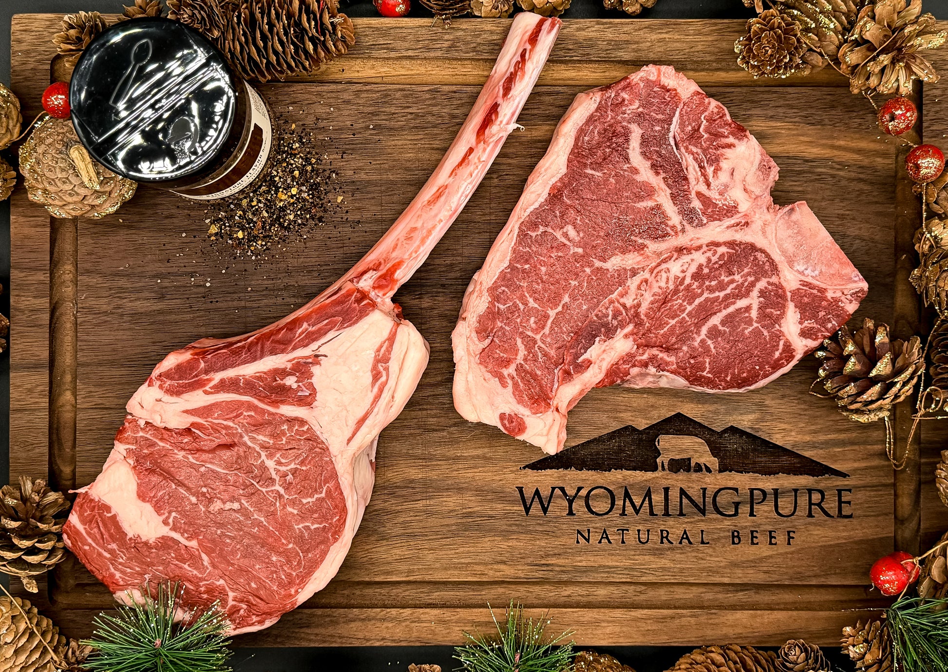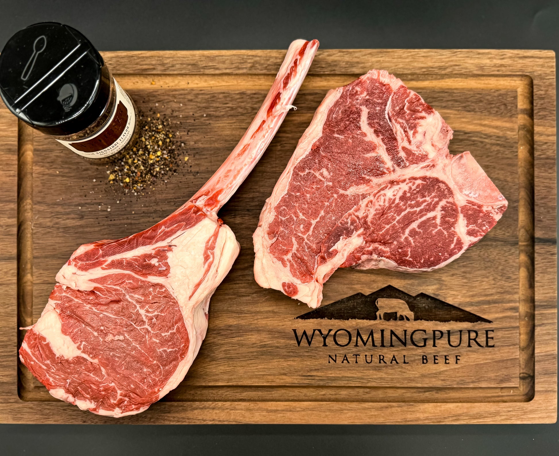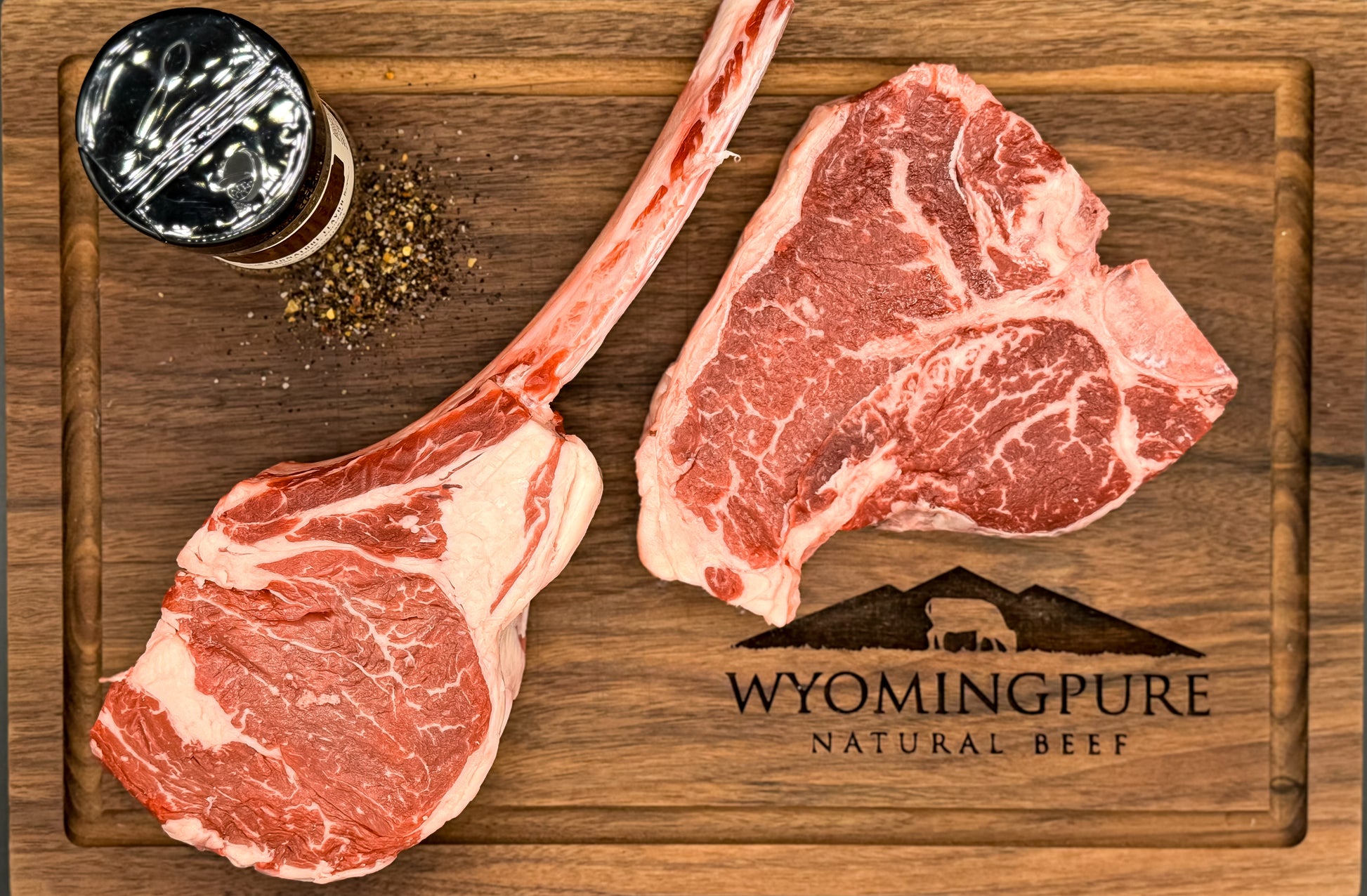 Trail Boss Original: A massive 36-40 oz Tomahawk Steak with 2 porterhouses and a jar of our favorite WyoHiser seasoning.