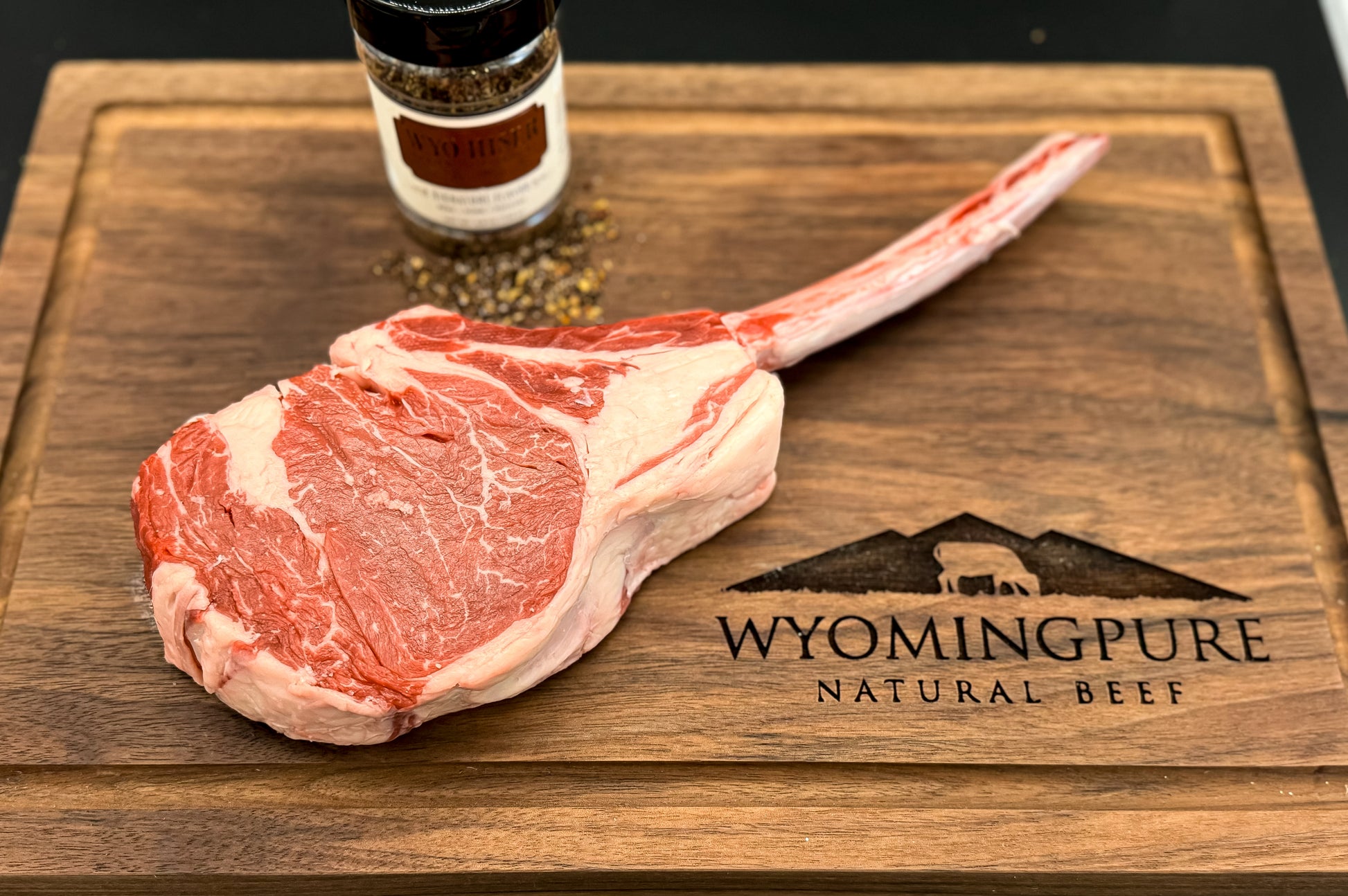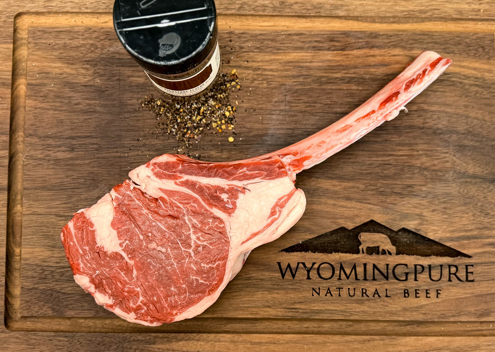 Trail Boss MINI: A 2 lb Tomahawk steak and a jar of our favorite WyoHiser Seasoning.